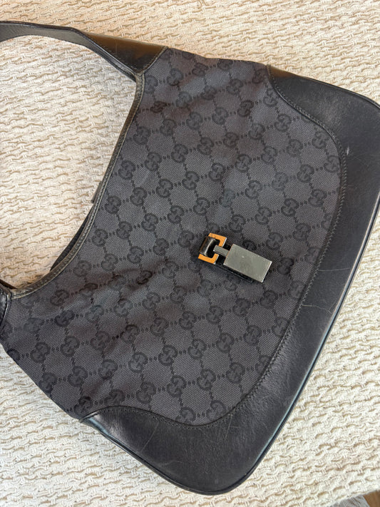 VINTAGE GUCCI JACKIE-O BLACK GG CANVAS LEATHER HOBO BAG