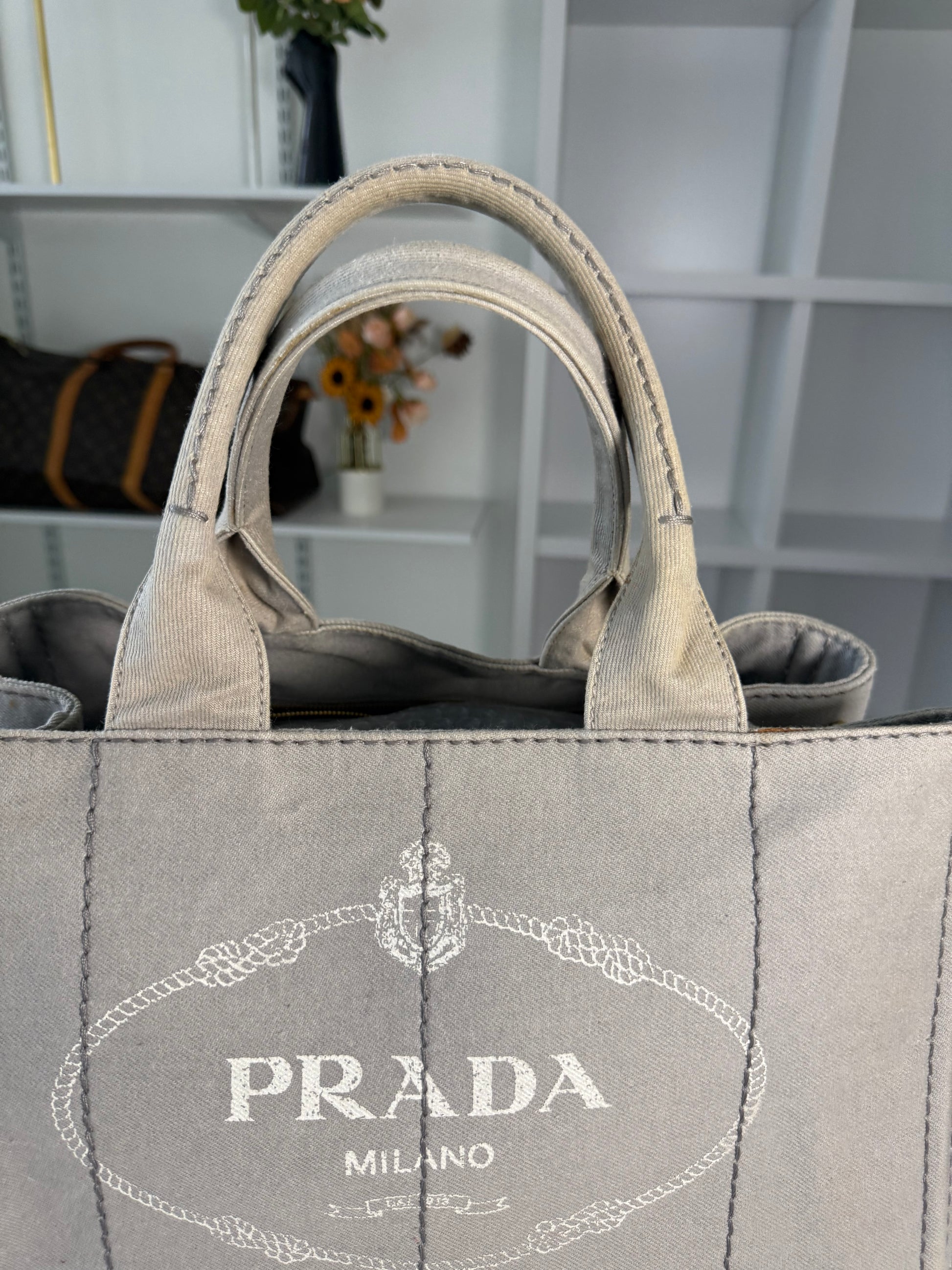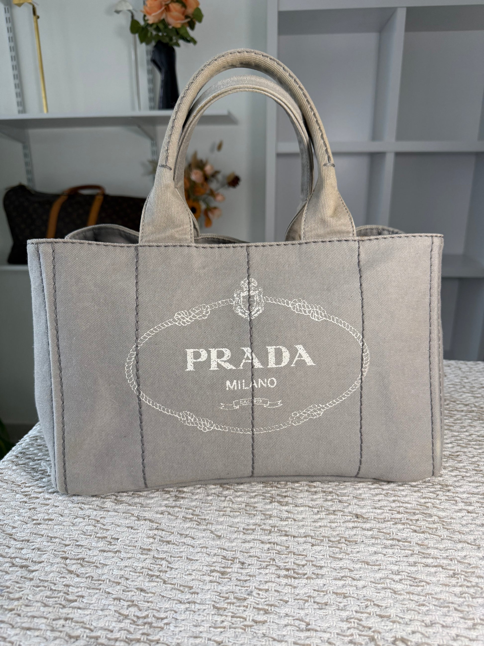 PRADA CANAPA TOTE BAG IN GREY DENIM CANVAS